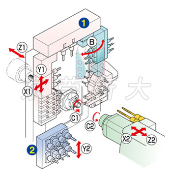 四、斯大走心機SR-20RIVtypeB了進一步實現多樣化復合加工,充實了背面側的功能,從而在背面刀架臺配備8軸鉆孔單元,并搭載Y2軸控制作為標配,在刀架臺上備有可通過操作系統控制的角度可變化的B軸動力單元,使得刀具可在工件外圓和端面上任意角度加工傾斜表面。