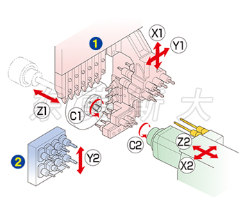 四、斯大走心機SR-20JIItypeB橫向鉆孔5軸單元下方2軸,采用模塊化設計,可根據工件需要自由安裝可交換式工具,實現工藝的靈活性,通過功能模塊的組合,輕松實現各種變化,以此獲得機床的最佳結構。