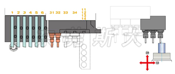 四、斯大走心機SB-16RtypeG在標準規格橫向鉆孔單元4軸的基礎上,可配備橫向鉆孔單元5軸型、可交換式橫向鉆孔單元5軸型/5軸高速型4種刀架臺,而可交換式橫向鉆孔單元5軸中的右側3軸及背面4軸單元,采用模塊化設計配備豐富的刀具單元,可根據工件需要自由安裝多種可交換式工具,展開多樣的復合加工。