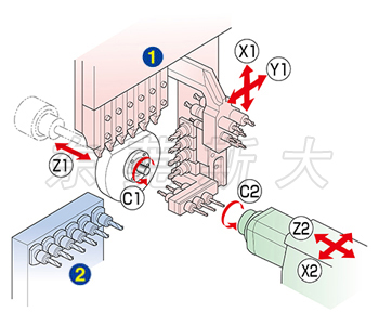 四、斯大走心機SR-32JIItypeA橫向鉆孔5軸單元下方2軸,采用模塊化設計,可根據工件需要自由安裝可交換式工具,實現工藝的靈活性,通過功能模塊的組合,輕松實現各種變化,以此獲得機床的最佳結構。