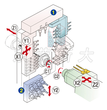 | 四、斯大走心機SR-20RIVtypeA了進一步實現(xiàn)多樣化復合加工,充實了背面?zhèn)鹊墓δ埽瑥亩诒趁娴都芘_配備8軸鉆孔單元,并搭載Y2軸控制作為標配,在刀架臺上備有可通過手動調(diào)節(jié)控制的角度型回轉動力單元,可使得刀具可在工件外圓和端面上加工帶角度的傾斜表面。 | |||